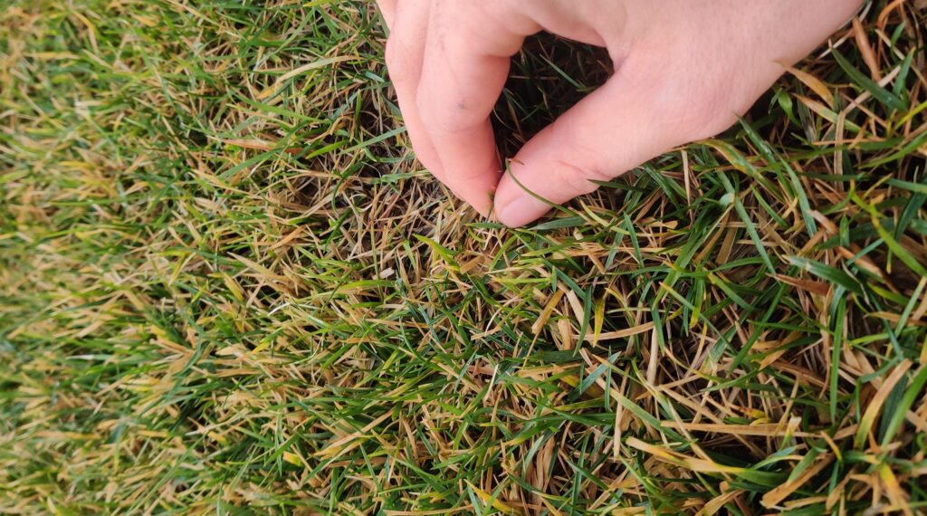 Il manto erboso quasi sicuramente presenta residui vegetali, seccume da malattia fungina come il Microdochium (marciume rosa), steli secchi o segni di attività di animali. Dove gela ripetutamente, il tappeto erboso imbrunisce a causa del fogliame necrotico e dei danni localizzati nella parte delle superiore delle foglie. Disseccamenti parziali sono molto probabili anche in assenza di gelo.